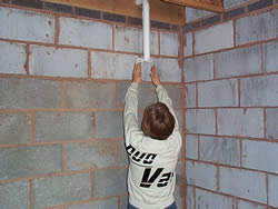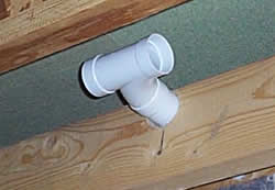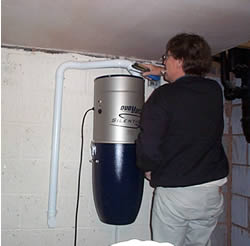 The first step is to choose the location of the vacuum power unit and wall inlets. Generally we recommend the vacuum power unit be installed in a garage. This permits the machine to be out of the way and the very small amount of noise it generates will be in a confined space. The next step is to find the shortest or easiest route between the vacuum power unit and the wall inlets in order to install the rigid tubing network. It is often best to follow existing installations for plumbing, heating, air conditioning or electrical wiring and take advantage of penetrations through floors and walls which have already been made. With good planning, it is possible to avoid messy jobs such as drilling through floors or opening walls to feed tubing in an already built home. The vacuum tubing networks can, therefore, go through walls and