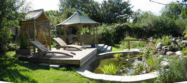 waterfall, deck and Jagram swing, loungers, bridge and pavillion